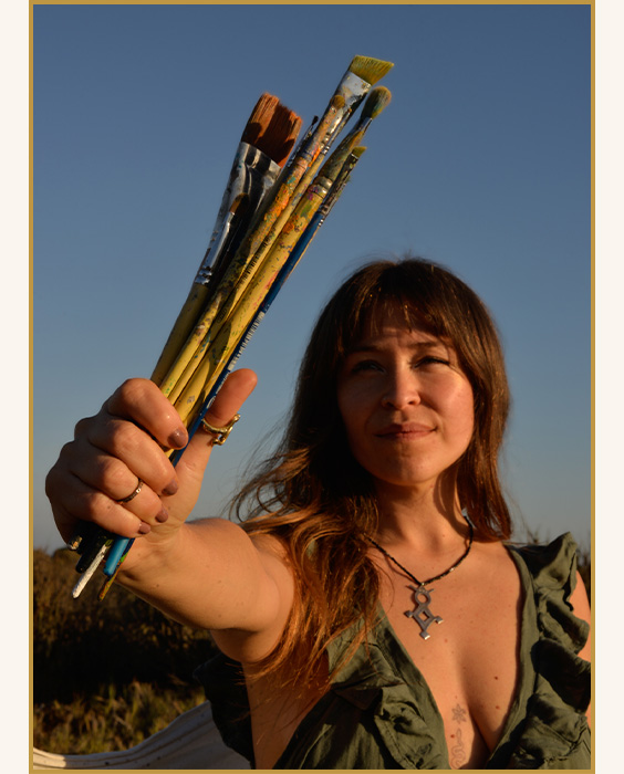 Camila is a self-taught multidisciplinary artist, known for her spiritual, visionary, therapeutic, and symbolic art—mainly acrylic and oil paintings on canvas. Her other creations include murals, event stage designs, and digital art.